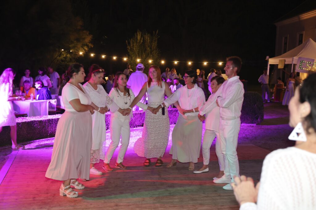 Jur pri ulazu u vrt je luk od bijelih balonov upozorio na geslo ovoga večera. A pri pogledu u vrt su se na jednu stran vidili bijeli stoli za stati, a na drugu stran bijeli stoli za siditi. Pred ulazom u kaštel je bio priredjen podij za tancanje.
